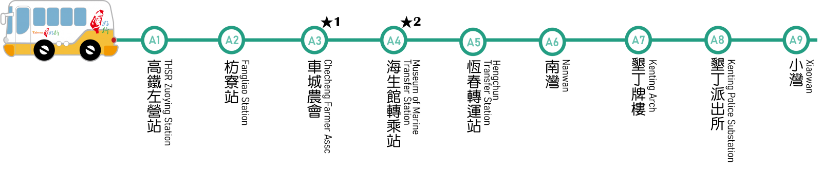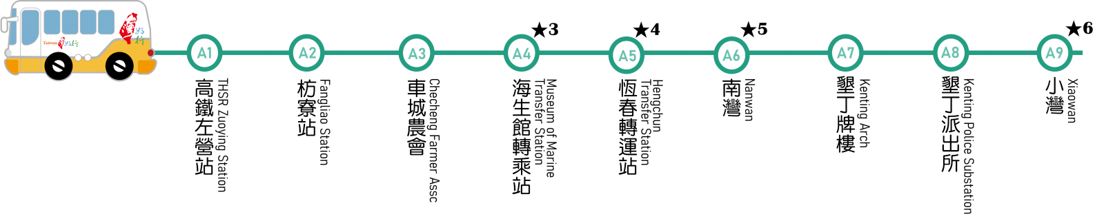 海生館轉(zhuǎn)乘站:南下可在此轉(zhuǎn)乘墾丁街車,接駁至海生館(墾丁街車一日券150元,當(dāng)日不限次數(shù)上下車,亦可車上投現(xiàn)里程計(jì)費(fèi)。)★註解4: