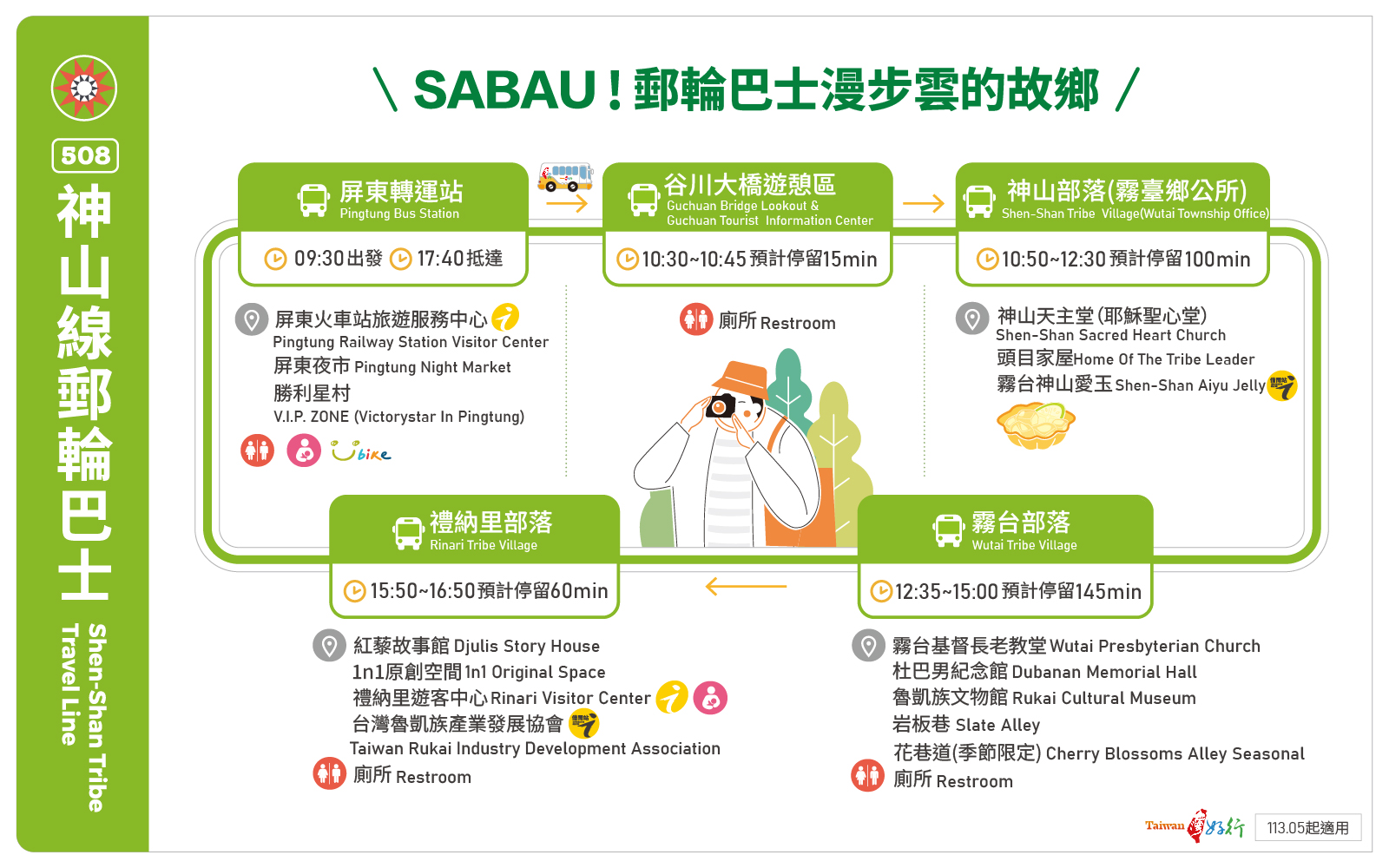 三、路線沿途??抗却ù髽颉⑸裆讲柯?、霧臺(tái)部落、禮納里部落,請(qǐng)依照導(dǎo)覽人員指示乘車(chē)。